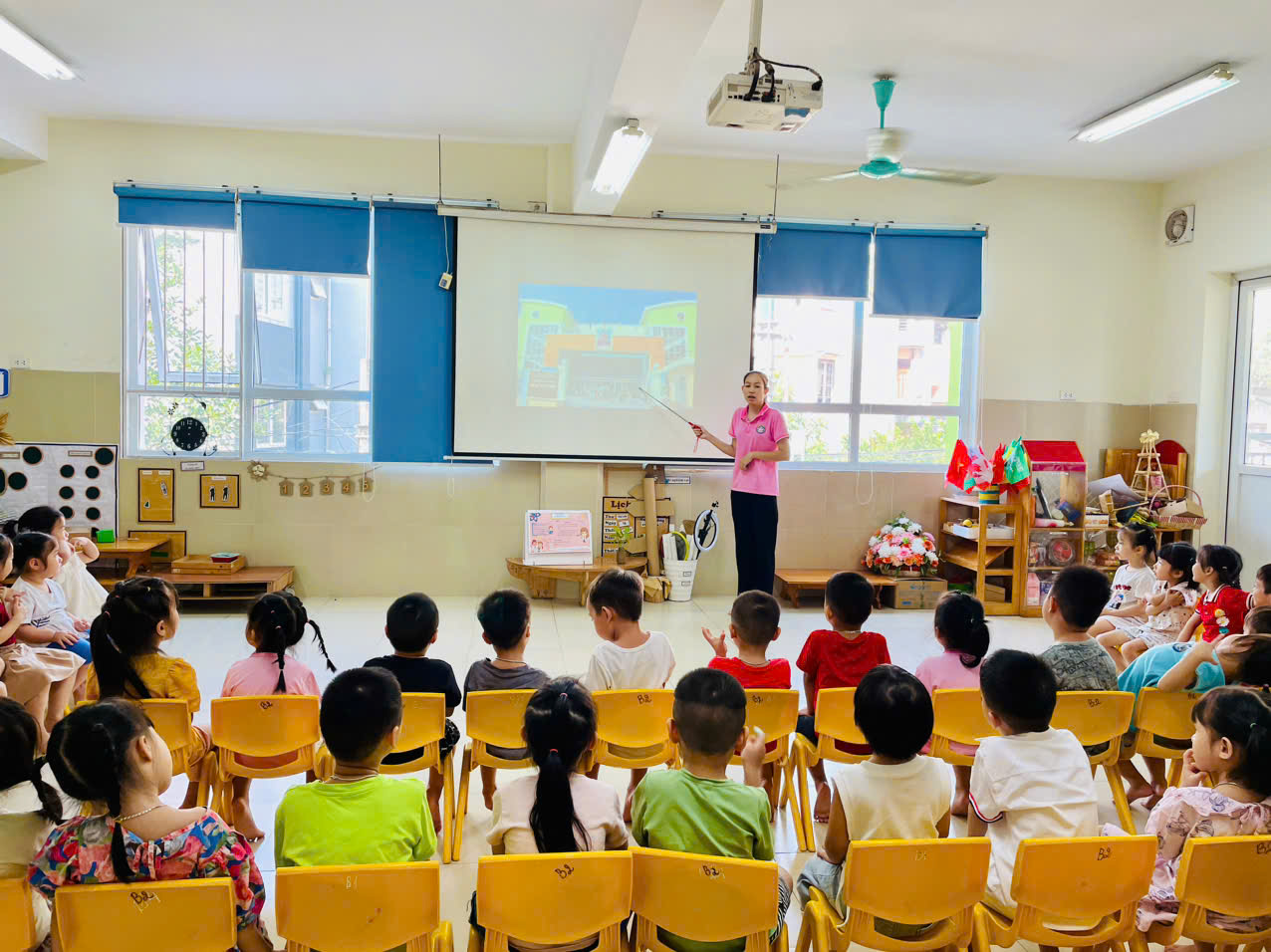 Cả lớp chăm chú lắng nghe cô giới thiệu về trường mầm non.