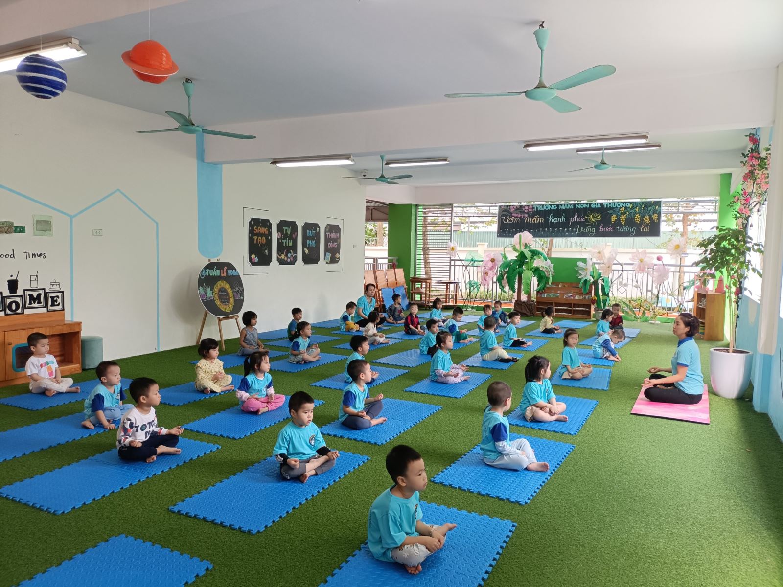 Yoga giúp trẻ ngủ ngon hơn, tăng cường hệ miễn dịch cho trẻ mang lại hiệu quả tốt nhất cho sự phát triển của trẻ. Yoga giúp trẻ mang lại một tinh thần tập trung, thư giãn, giải tỏa căng thẳng và kích thích sự phát triển cơ xương khớp ở học sinh. Như vậy với trẻ, Yoga vừa giúp tăng cường và duy trì độ dẻo dai, linh hoạt vừa mang đến một hình thể cân đối, đảm bảo sự hoàn thiện về thể chất và tinh thần nhằm mang đến sự phát triển tối ưu cho trẻ trong những năm đầu đời. Trẻ 3 tuổi đã có thể tập yoga, luyện tập càng sớm sẽ cải thiện tình hình sức khỏe rõ rệt như tăng cân, khỏe mạnh hơn, dẻo dai hơn, nhanh nhẹn hơn,...Hôm nay cô và trò lớp MGB C2 cùng nhau tham gia tập Yoga. Dưới đây là 1 số hình ảnh của hoạt động: