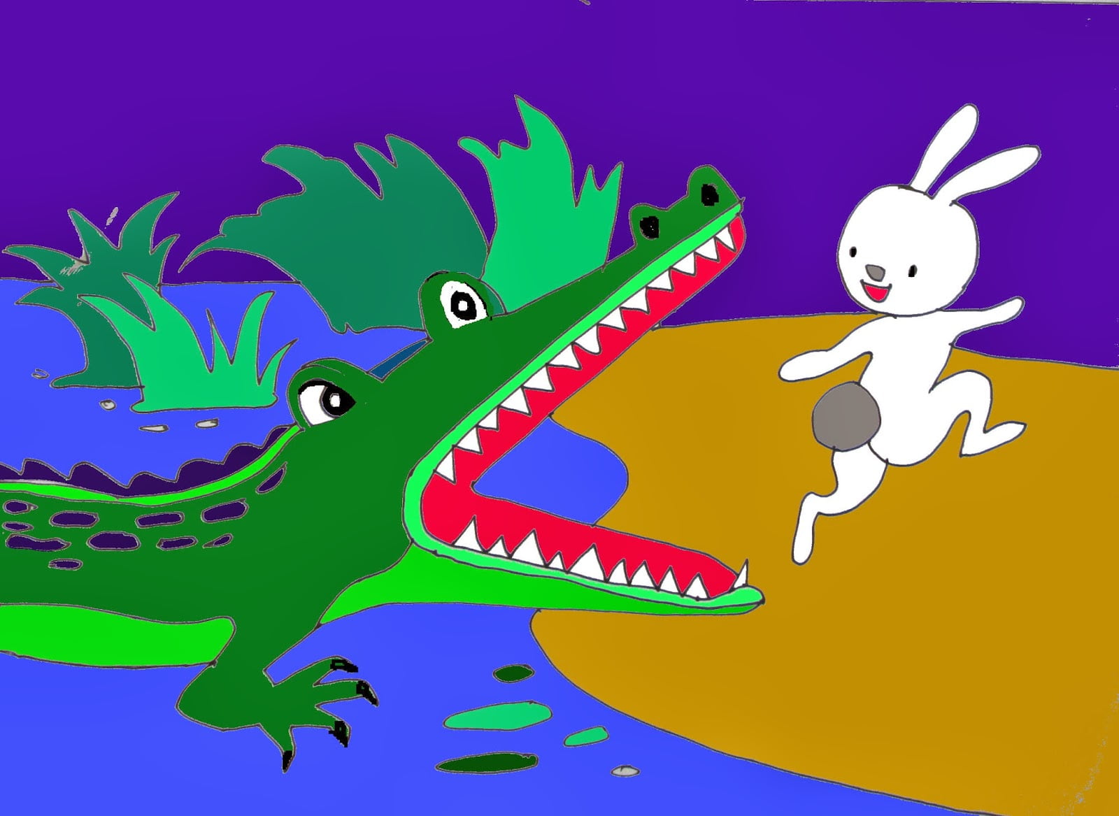 Thỏ đã nằm gọn trong hàm Cá Sấu , tuy rất sợ hãi nhưng vẫn bình tĩnh tìm kế thoát thân.