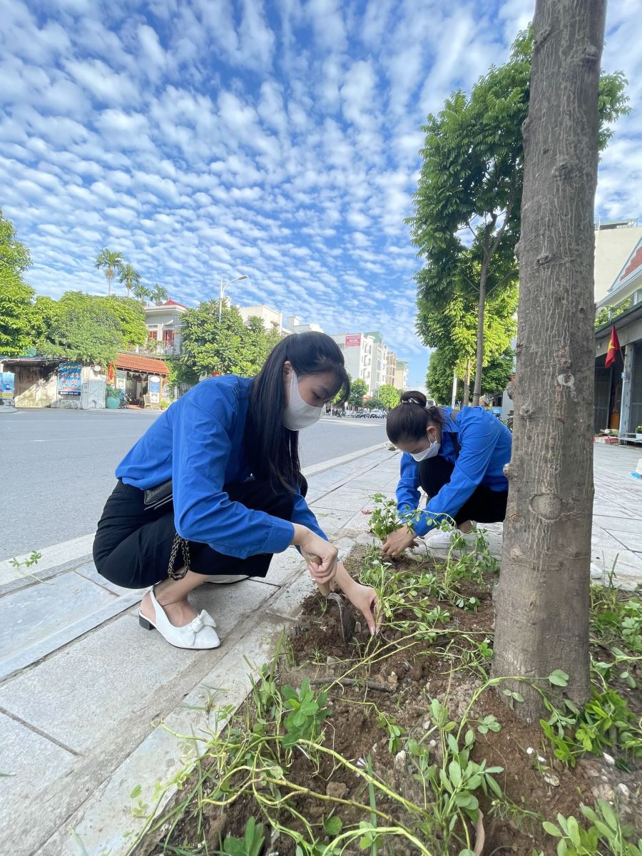 Thanh niê !important;n Chi Đoàn Trường mầm non Gia Thượng tỉ mỉ trồng từng khóm cây