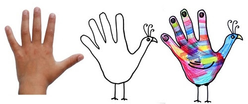 Ú !important;p bàn tay vào giấy, ngón tay xòe đều. Hình vẽ bàn tay hiện ra rất quen thuộc ở tư thế đứng. Bé vẽ thêm hai chân chim thẳng phía dưới bàn tay, ngón chân xòe ra chạc ba.