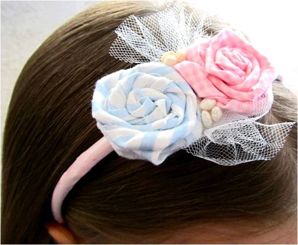 Hoa hồng cuộn từ vải kẻ trông khá dễ thương, chút nền voan tăng thêm phần thơ mộng, rất hợp trang trí bờm tóc cho bé.