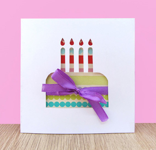 Sử dụng giấy gói quà có hoạ tiết kẻ sọc nhiều màu giúp cho hình bánh sinh nhật của bạn thêm sinh động như đang được trang trí kem tươi đầy màu sắc. Những ngọn nến thắp sáng theo sự trùng màu tự nhiên cũng khá thú vị. Một tấm thiệp đơn giản nhưng thật tươi vui và phù hợp với không khí sinh nhật!