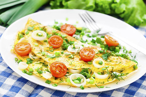 - Xếp rau ra đĩa, cho hỗn hợp trứng lên trên, đảo đều.