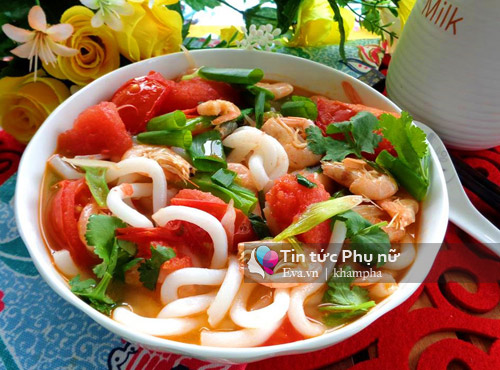 Bước 2: Bắc nồi lên bếp, cho vào 1 muỗng canh dầu, chờ dầu nóng cho hành vào xào thơm, sau đó cho tôm vào xào nhanh với nước mắm và các gia vị cùng cá chua. Tiếp đến cho vào 1 tô nước lạnh nấu sôi.