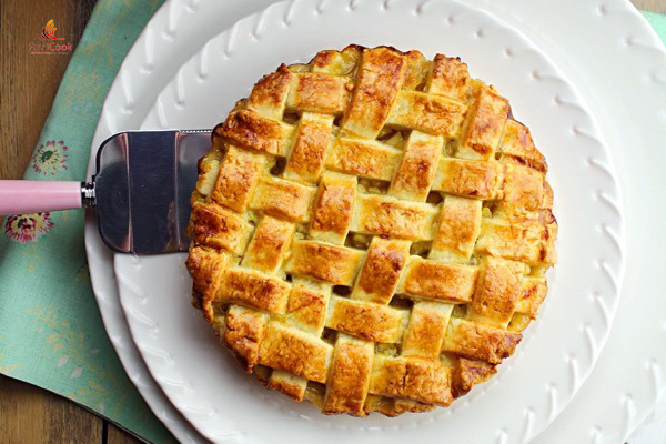 Bước 6: Phần bột còn lại bạn cắt thành những dài và hẹp, sau đó sắp xếp so le theo chiều dọc và chiều ngang, cứ như vậy cho tới khi phủ kín phần nhân bánh. Cắt hết toàn bộ phần dư thừa xung quanh, quét một lớp nhỏ dầu ăn lên mặt bánh và nướng trong lò khoảng 25 phút ở nhiệt độ 200 đô C.