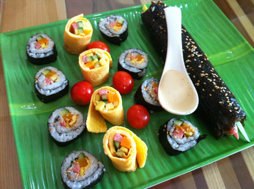 Ngoài ra, nếu không có mành tre và không mua được rong biển, mẹ có thể cuộn trứng và rau củ cho bé. Các con sẽ rất thích món trứng cuộn đủ màu sắc đấy.