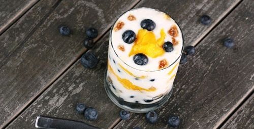 Bước 2: Chuẩn bị các cốc thủy tinh sạch. Bắt đầu với lớp việt quất ở dười cùng, tiếp theo là rắc 1 chút yến mạch nghiền vụn và tiếp đó là 1 lớp sữa chua