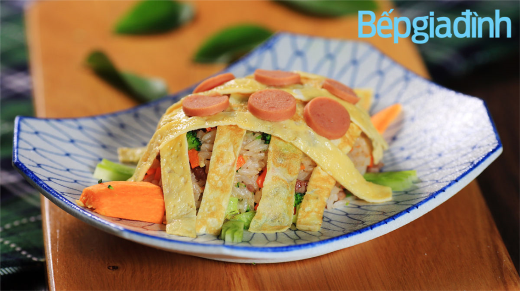§ Cho cơm chiên bò rau củ ra chén, nén chặt cho ra đĩa làm mai rùa, xếp từng dải trứng đan xéo và xúc xích lên trên tạo hình. Cho thêm đầu và chân làm từ cà rốt và bông cải lên. Nhớ cho thêm mắt rùa mẹ nhé!