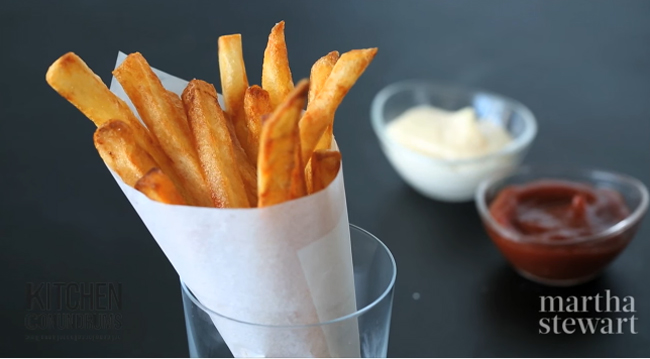 Một đầu bếp chuyên nghiệp sẽ có cách "trị" món khoai chiên đỏng đảnh này – và nó thậm chí còn không tốn một xu cơ! Đầu bếp Thomas Joseph tiết lộ bí quyết để chiên khoai ngon của anh là... nước. Chỉ cần ngâm với nước trong thời gian thích hợp, lượng tinh bột trong khoai tây sẽ được loại bỏ bớt, giúp bên trong mau chín và bên ngoài giòn tan, cộng thêm màu vàng vô cùng đẹp mắt nữa.