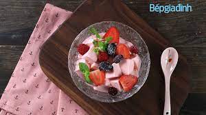 - Lấy sữa chua dẻo ra cắt thành miếng vuông vừa ăn, ăn kèm trái cây rất ngon. Chúc bạn thành công với hướng dẫn cách làm sữa chua dẻo mứt mâm xôi trái cây ngon, ngọt, mát lạnh.