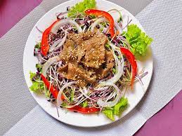 Cho thịt bò !important; đã xào chín vào, trộn đều. Xếp ra đĩa, cho thêm sốt mayone lên trên