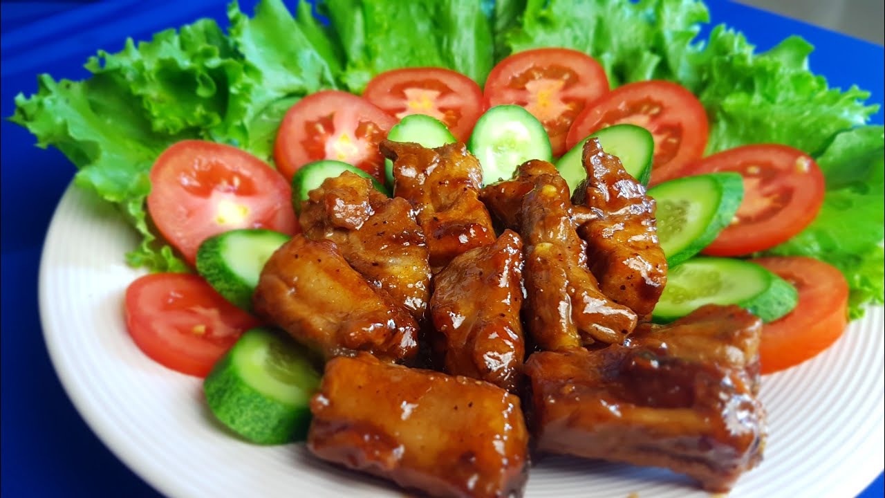 - Cho sườn vào đun lửa liu riu đến khi nước sốt sệt lại và bám đều vào miếng thịt.