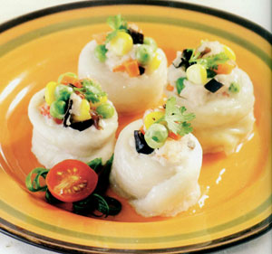 Trụng chín cà-rốt, đậu Hà Lan và ngô. Làm sốt: Đun sôi nước dùng với gừng, 1 thìa cà-phê dầu vừng, thêm 1 thìa cà-phê bột năng pha nước để tạo độ sánh.