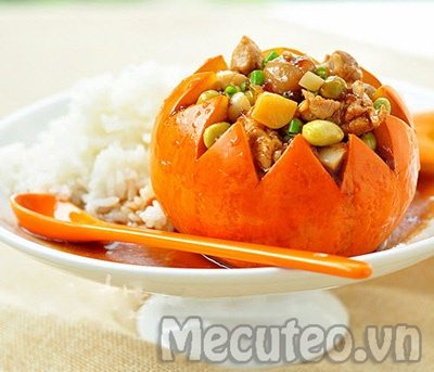 Ức gà (hoặc đùi gà) cắt miếng vừa ăn cộng với một nắm đậu trắng hay đậu hà lan, tất cả trộn đều gia vị, ướp trong vòng 1 tiếng rồi cho vào 1 quả bí đỏ Nhật đã bỏ ruột, hấp cách thủy hoặc hầm chín, mẹ đã cho con một món ăn vừa đẹp mắt, vừa thơm ngon và giàu dinh dưỡng. Thịt gà và hạt đậu cũng như bí đỏ rất giàu kẽm.