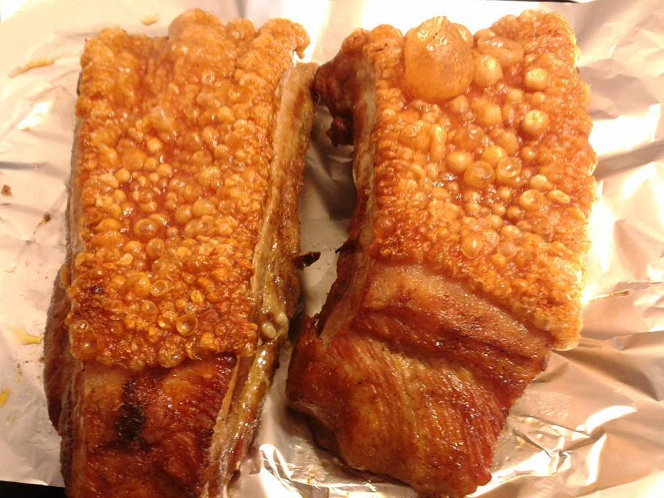 Bỏ ra gạt sạch sẽ muối, lau sạch bì và khay, đổ vào khay lưng bát con nước sôi cho vào lò tiếp tục nướng thêm 30 phút vẫn để lửa 250°C, cả trên và dưới đợi bì nổ hết là đc.