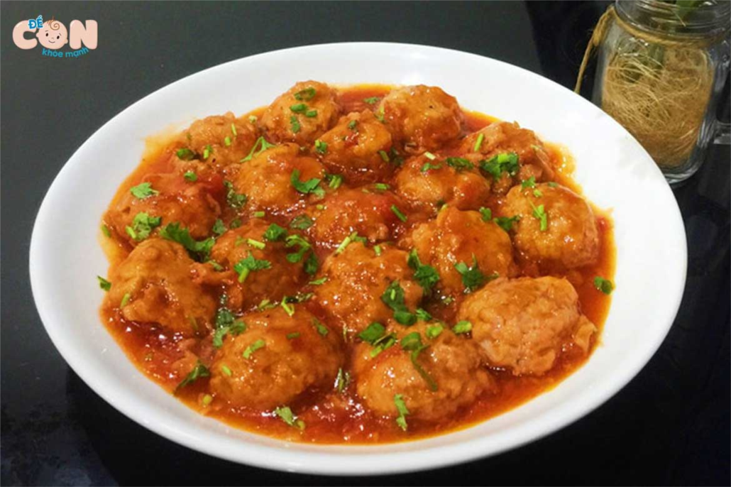Từng viên thịt tròn tròn, mềm, béo ngậy thấm nước sốt cà chua với vị chua dịu và các loại lá gia vị thơm ngon sẽ khiến bé thấy ngon miệng hơn đấy!