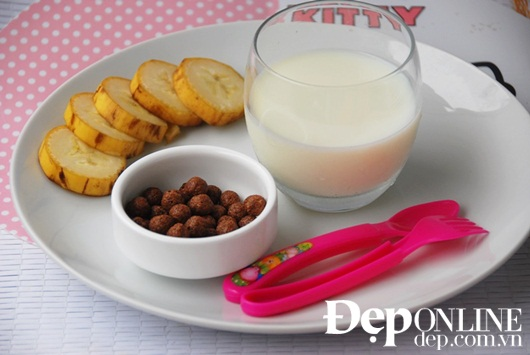 1. Bữa sáng và xế: Sữa, trái cây và ngũ cốc hay bánh quy (tùy thời gian con thức giấc mà mẹ có thể cho con ăn theo giờ nào).