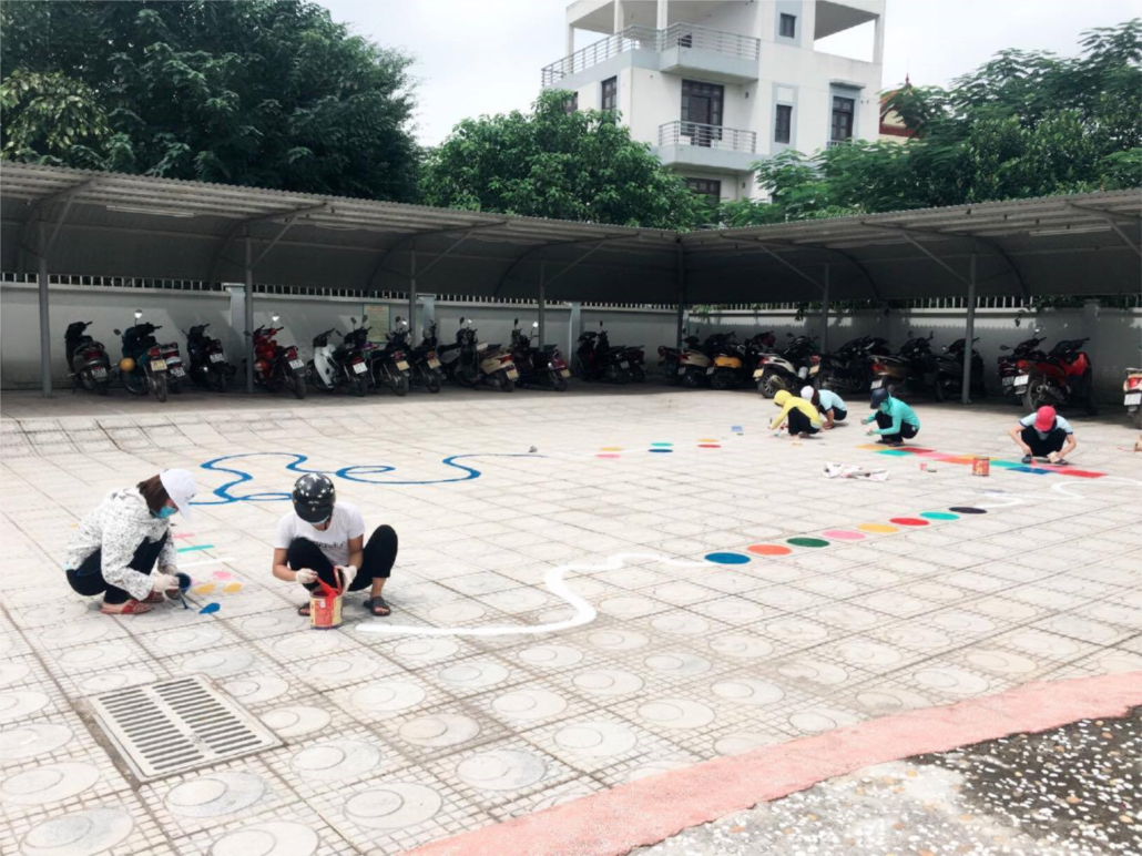 Một số ảnh các cô đang vẽ khu trò chơi PT thể chất cho trẻ