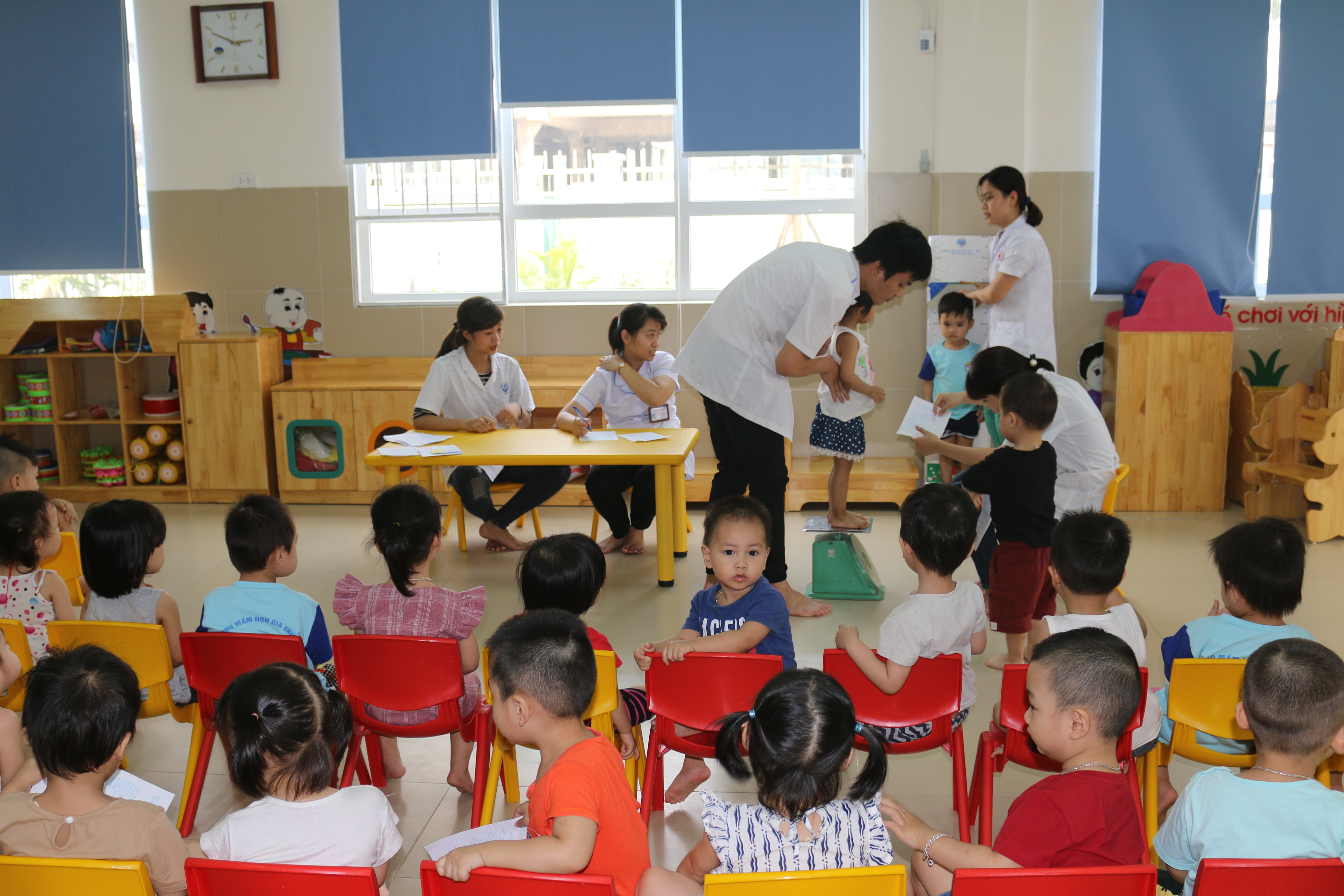Để thực hiện tốt công tác cân, đo cho trẻ trước khi nghỉ hè nhà trường đã phối hợp với trạm y tế phường Ngọc Thụy tổ chức cân đo cho từng lớp. Các lớp chuẩn bị danh sách trẻ và thông báo tới 100% phụ huynh được biết lịch cân đo của từng nhóm lớp để phụ huynh đưa con đi học đầy đủ.