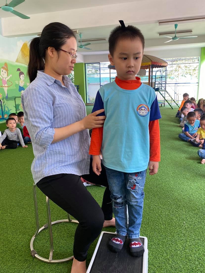 Từ ngày mùng 08/12 đến 10/12 năm 2020 giáo viên tại các lớp đã phối hợp cùng đ/c nhân viên y tế của nhà trường đã tiến hành cân, đo cho 100% trẻ tại trường. Sau đợt cân, đo nhân viên y tế thống kê tổng hợp kết quả đưa về từng lớp, giáo viên các lớp có nhiệm vụ thông báo đến phụ huynh qua hệ thống bảng tuyên truyền và trao đổi trực tiếp với từng phụ huynh với các trường hợp trẻ SDD, thừa cân, thấp còi, (đứng cân so với đợt I) để kết hợp cùng thực hiện tốt các biện pháp can thiệp giúp trẻ khỏe mạnh và phát triển toàn diện.