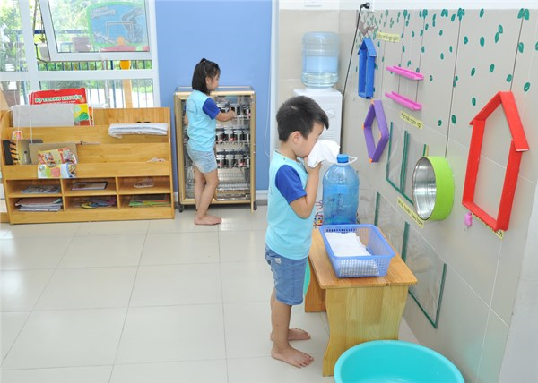 Mỗi trẻ đều được sử dụng khăn mặt và cốc uống nước riêng. Khăn mặt và cốc đều được luộc và hấp vào cuối giờ học sau khi đã làm sạch khăn mặt và cốc bằng xà phòng.