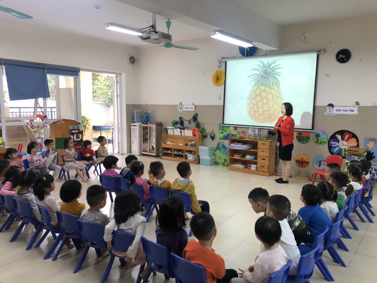 Các bé đang chăm chú lắng nghe cô đàm thoại về quả Dứa