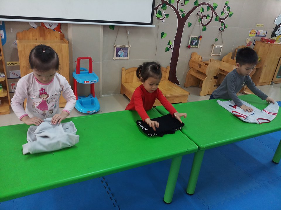 Chính vì vậy , ngay ở cấp bậc mầm non các cô đã đưa việc giáo dục kĩ năng tự phục vụ vào việc giảng dạy cho trẻ. Hôm nay các bé lớp mẫu giáo bé C2 đã được học kĩ năng gấp quần áo. Các bạn rất thích thú và gấp quần áo rất nhanh. Hy vọng từ những kĩ năng phục vụ nhỏ nhất này sẽ giúp các bé có tính tự lập cao hơn.