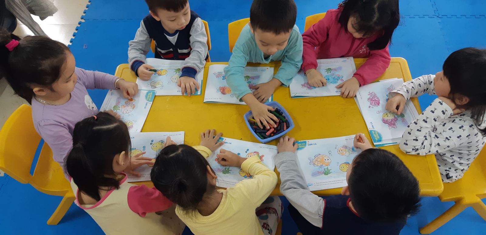 Các bạn đang tô nét vây cá và tô màu con cá.