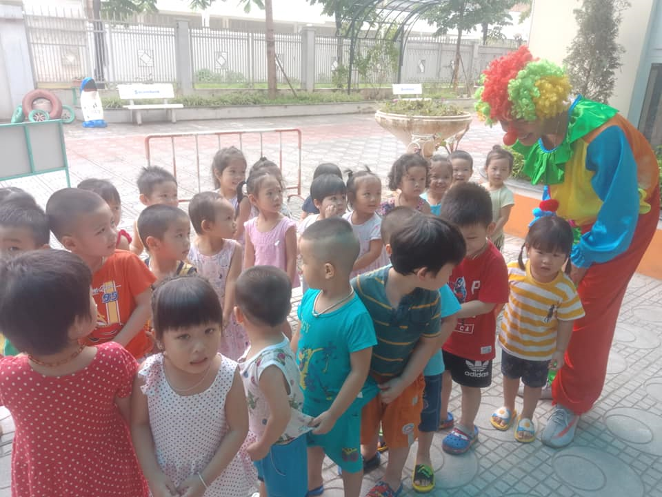 Không chỉ được ra sân trường chơi và tham gia hoạt động vui nhộn. Lớp C2 còn được các nhận vật Chú Hề, Gà Trống và Micky ghé thăm lớp và chơi cùng các bạn nhỏ đấy.