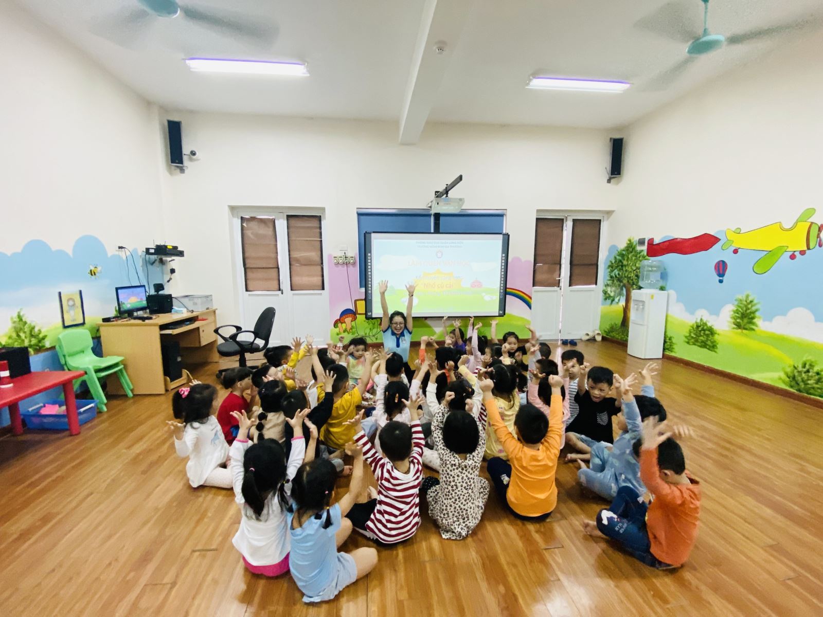 Các bạn nhỏ được cô giáo kể chuyện với sách truyện chiếu bóng đấy