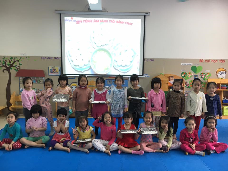 Các bé được cô giáo giới thiệu về ngày Tết hàn thực, được xem quy trình nặn bánh trôi, bánh chay.