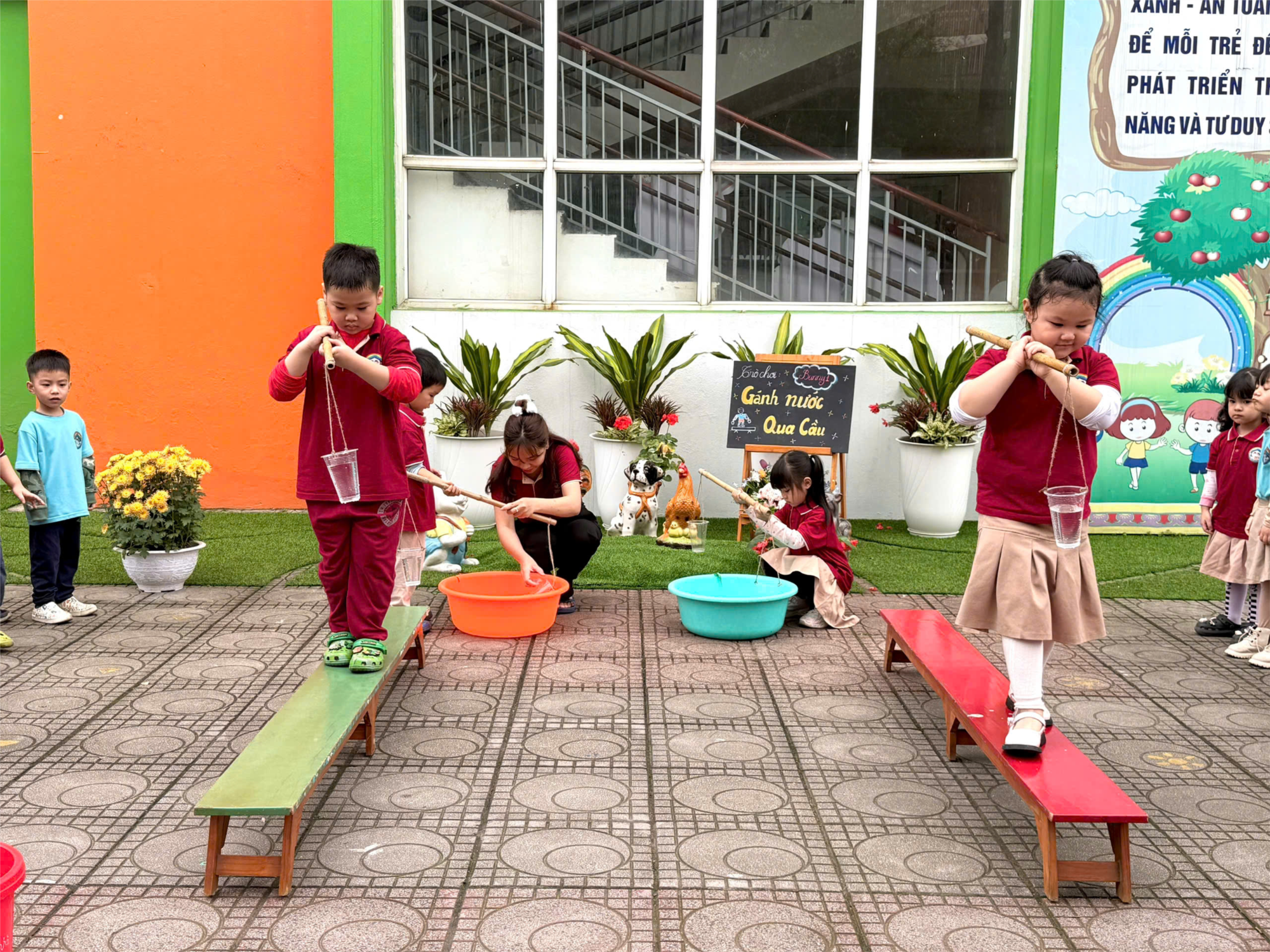 Trò chơi còn là dịp để các bé làm quen với những hoạt động tập thể, học cách làm việc nhóm và chia sẻ niềm vui cùng bạn bè. Những tiếng cười giòn tan vang lên mỗi khi các bé hoàn thành thử thách hay khi xảy ra những tình huống bất ngờ khiến cả nhóm cùng nhau giải quyết. Ngoài ra, trò chơi "gánh nước qua cầu" còn giúp các em hiểu rõ hơn về những giá trị văn hóa dân gian, qua đó nuôi dưỡng tình yêu thương và sự tự hào với những trò chơi truyền thống của dân tộc. Với không khí vui tươi, sôi động, trò chơi này luôn là một phần không thể thiếu trong ngày hội, mang lại cho các bé những kỷ niệm đẹp và bổ ích.
