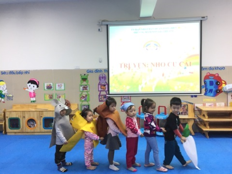Tham gia vào giờ học bé thích nhất được hóa thân vào các nhân vật, đóng kịch dựng lại câu truyện. Bạn làm ông lão được trồng củ cải và nhổ củ cải to, bạn lại đóng làm bà lão túm áo ông nhổ củ cải, bạn là cô cháu gái xinh xắn, còn bạn mặc áo mèo, áo chó, chuột, tất cả cùng nhau lấy hết sức để nhổ cải lên trông thật đáng yêu làm sao! Bé càng hào hứng hơn khi được các bạn bên dưới cổ vũ, cả buổi học đều là những tiếng cười ròn rã.