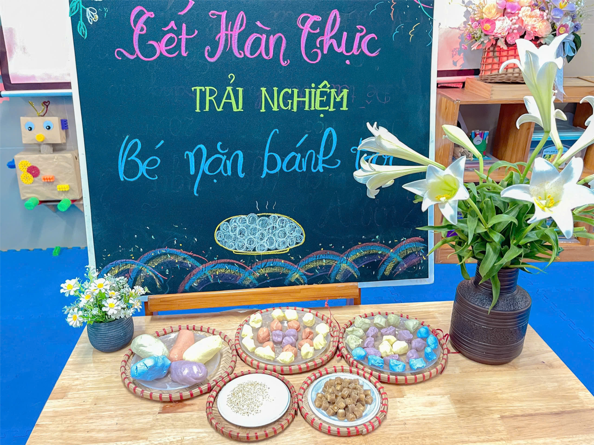 Hôm nay, không khí tại lớp C1 – Trường Mầm non Gia Thượng rộn ràng hơn bao giờ hết khi các bé được tham gia hoạt động trải nghiệm làm bánh trôi ngũ sắc nhân dịp Tết Hàn thực (3/3 âm lịch). Dưới sự hướng dẫn của cô giáo, những đôi bàn tay bé xinh đã cẩn thận vo tròn từng viên bột, cho nhân vào giữa, nặn tròn trịa những chiếc bánh trôi đáng yêu. Bột được nhuộm từ các nguyên liệu tự nhiên như: lá nếp, gấc, nghệ, lá cẩm, bột than tre… tạo nên những viên bánh trôi rực rỡ sắc màu nhưng vẫn an toàn, lành tính với trẻ nhỏ. Sau khi nặn xong, các bé được thưởng thức chính những chiếc bánh do mình làm ra. Ôi chao, ánh mắt háo hức và nụ cười rạng rỡ của các con khi cắn miếng bánh đầu tiên chính là món quà ngọt ngào nhất trong ngày hôm nay! Hoạt động làm bánh trôi không chỉ mang ý nghĩa gìn giữ nét đẹp truyền thống dân tộc mà còn giúp các bé rèn luyện sự khéo léo, kiên trì và nuôi dưỡng tình yêu với ẩm thực Việt Nam. Một ngày Tết Hàn thực thật vui và đáng nhớ với các bé lớp C1!