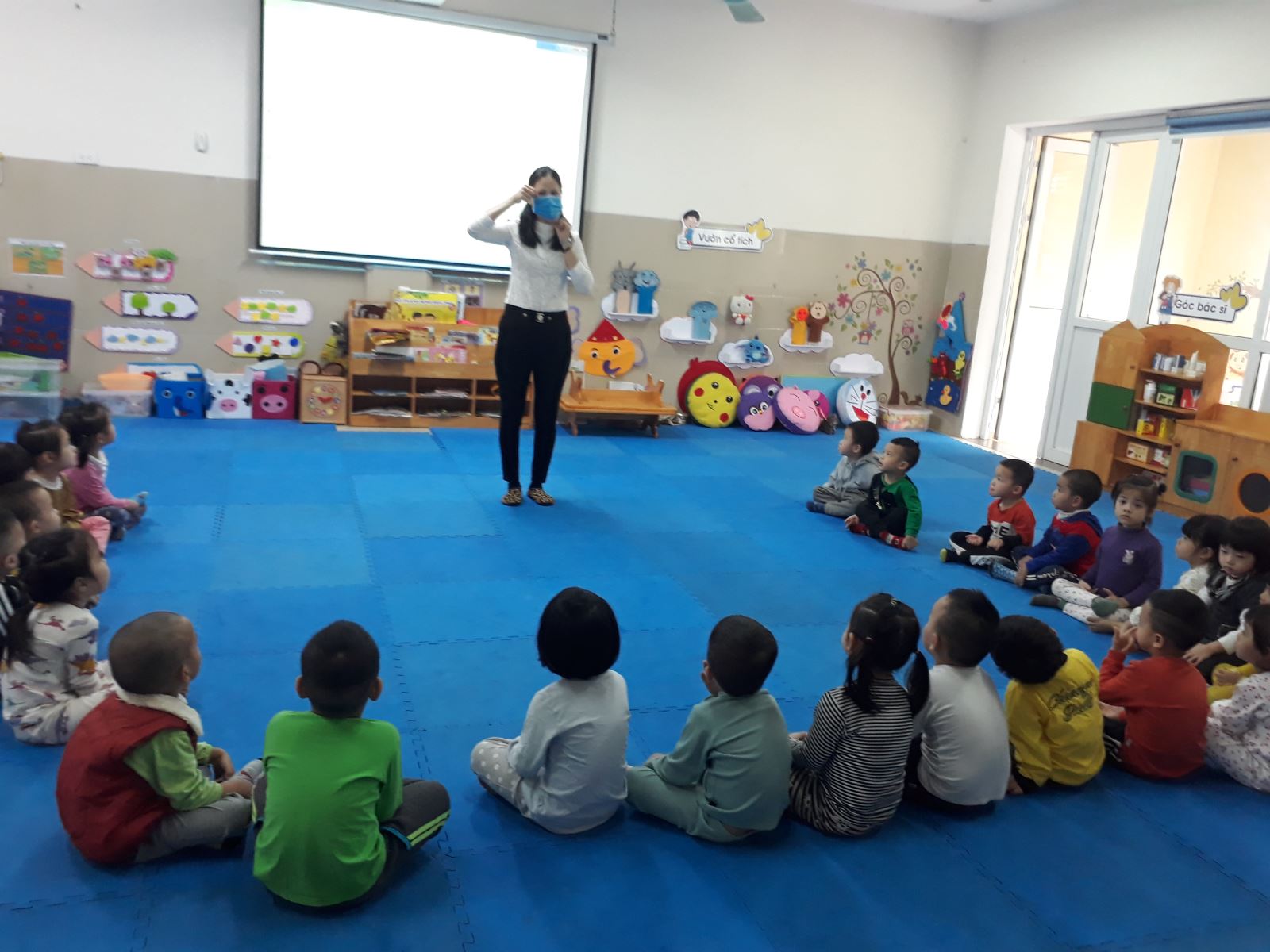 Cô giáo tớ hướng dẫn cách đeo khẩu trang để phòng chống dịch bệnh.