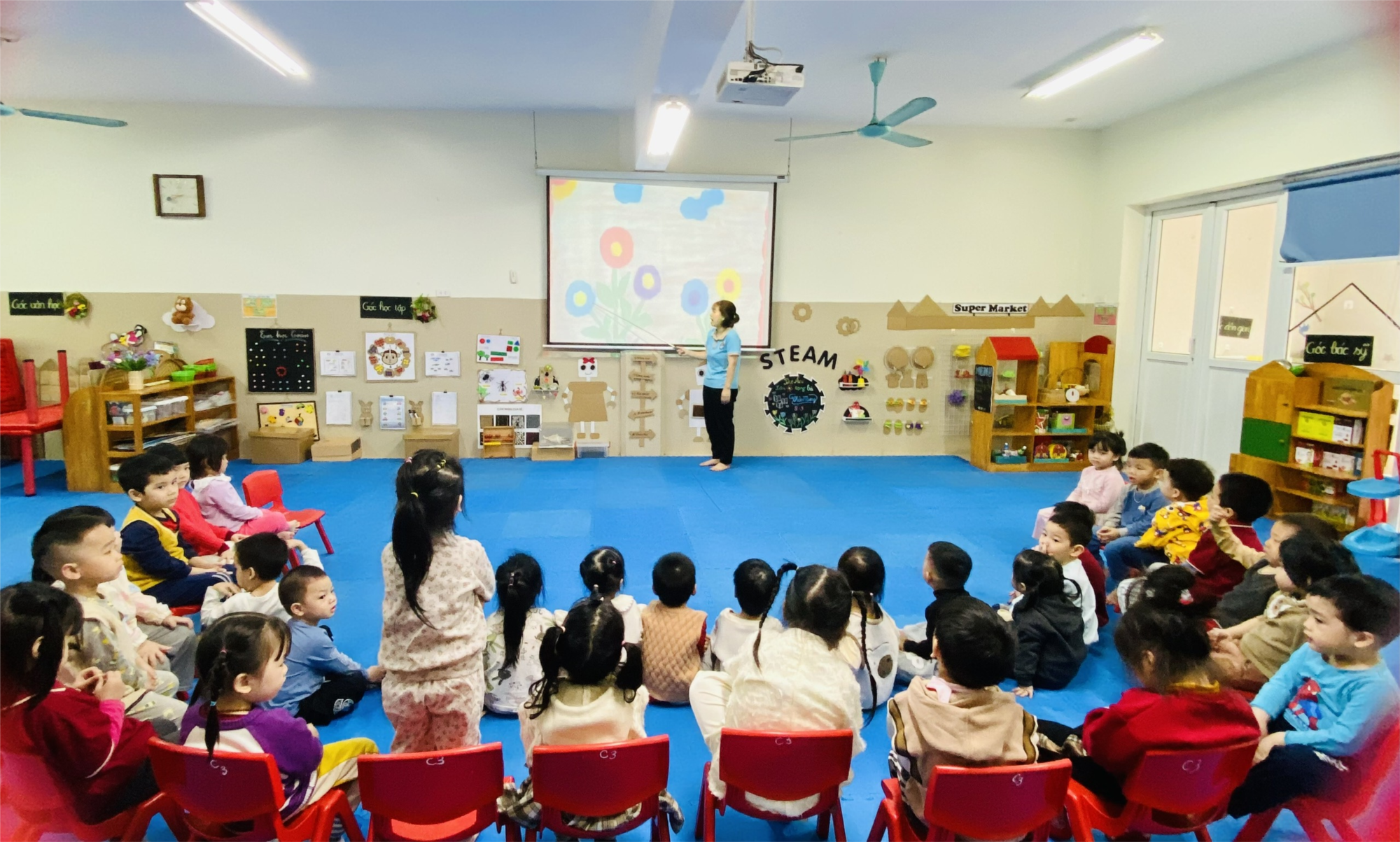 Hoạt động tạo hình hay còn gọi là nghệ thuật tạo hình sẽ giúp trẻ có cơ hội tìm hiểu, nghiên cứu các đối tượng cụ thể, từ đó có thể tự hình dung xây dựng về đối tượng đó. Vai trò chính mà hoạt động tạo hình là giúp trẻ phát triển trí tuệ: tư duy, trí tưởng tượng, trí nhớ… tăng vốn kiến thức về thế giới quan cho trẻ. Để giúp trẻ hứng thú với hoạt động tạo hình. Cô giáo phải luôn trau dồi kiến thức để tạo cho mình khối lượng kiến thức phong phú đa dạng nhằm cung cấp cho trẻ. Cần tận dụng những thời điểm phù hợp lôi cuốn sự hứng thú của trẻ, lôi cuốn trí tò mò của trẻ, để tạo cho trẻ tâm lý thoải mái cho trẻ hoạt động. Tận dụng mọi nguồn nguyên liệu từ thiên nhiên tạo ra thêm những đồ dùng đẹp mắt, có ích cho cuộc sống để từ đó giáo dục cho trẻ tính tiết kiệm, tính sáng tạo từ những vật dụng thiên nhiên. Tạo môi trường mở cho trẻ hướng trẻ lại gần môi trường thiên nhiên, tạo môi trường mở giúp trẻ phát triển hết khả năng tư duy, sáng tạo của trẻ, kích thích trí tò mò, thích khám phá của trẻ.Các bạn nhỏ lớp mẫu giáo bé C3 hôm nay sẽ thể hiện tình yêu bà, mẹ và các cô qua hoạt động tạo hình dán hoa tặng bà, mẹ, cô nhân ngày 8/3. Để trẻ được phát triển những cảm xúc tích cực đầu tiên rõ ràng nhất khi tiếp xúc trực tiếp với cái đẹp, đặc biệt trong nghệ thuật tạo hình. Bây giờ các bạn cùng chúng tớ dán hoa nhé.