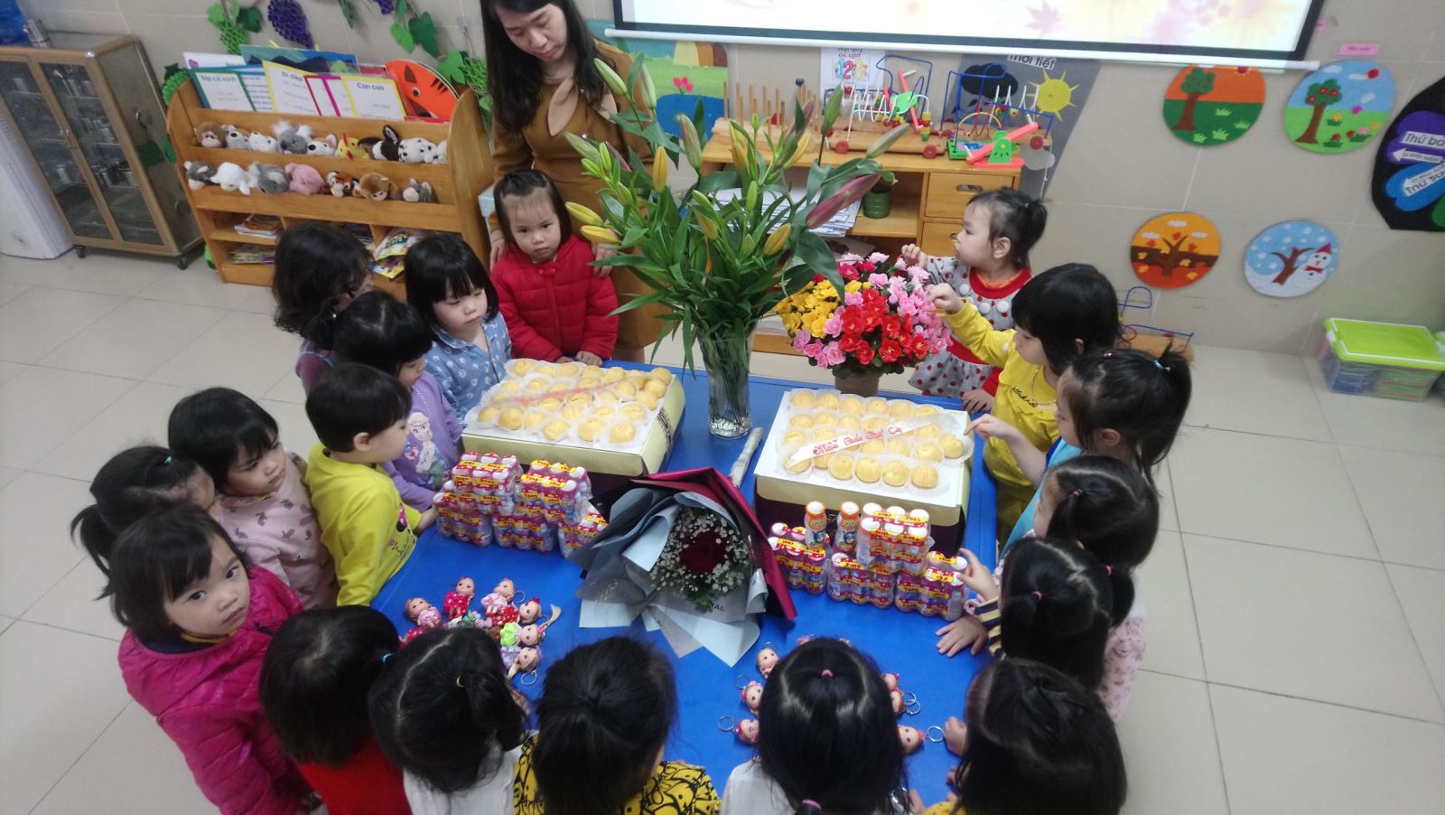 Các bạn gái được nhận hoa và quà của Ban Phụ Huynh lớp rất vui và thích quá ạ