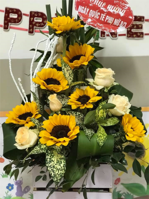 Chúng con đang gắn hoa để tạo thành bó hoa thật đẹp đấy ạ!