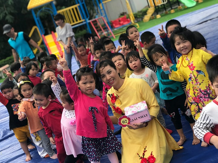 Niềm vui của cô và trò khi thành viên lớp đạt giải nhất trong trò chơi.