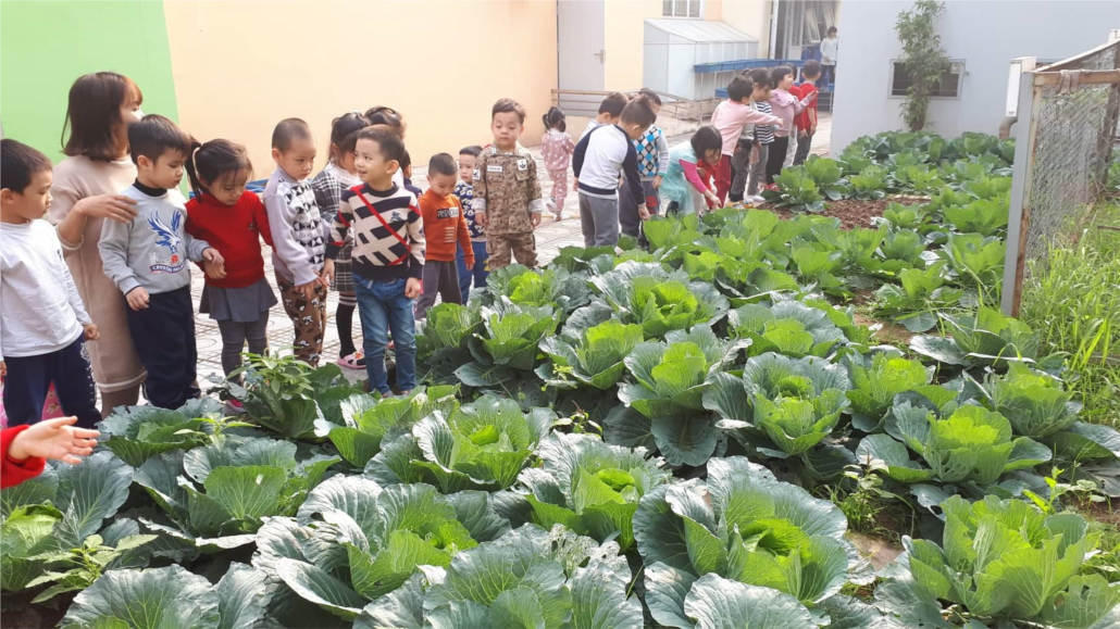 Các bé cùng tham quan vườn rau của trường.