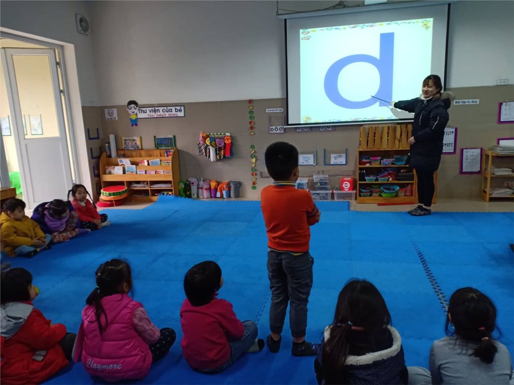 cô giáo giới thiệu chữ cái "b" cho trẻ