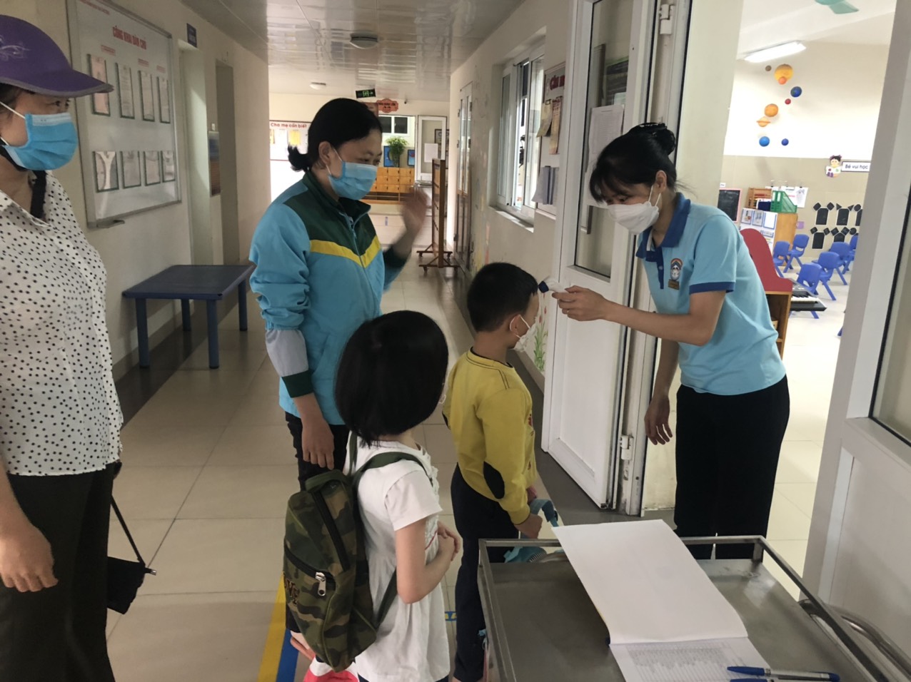 Các bé được đo thân nhiệt, sát khuẩn tay và tạm biệt các cô khi ra về