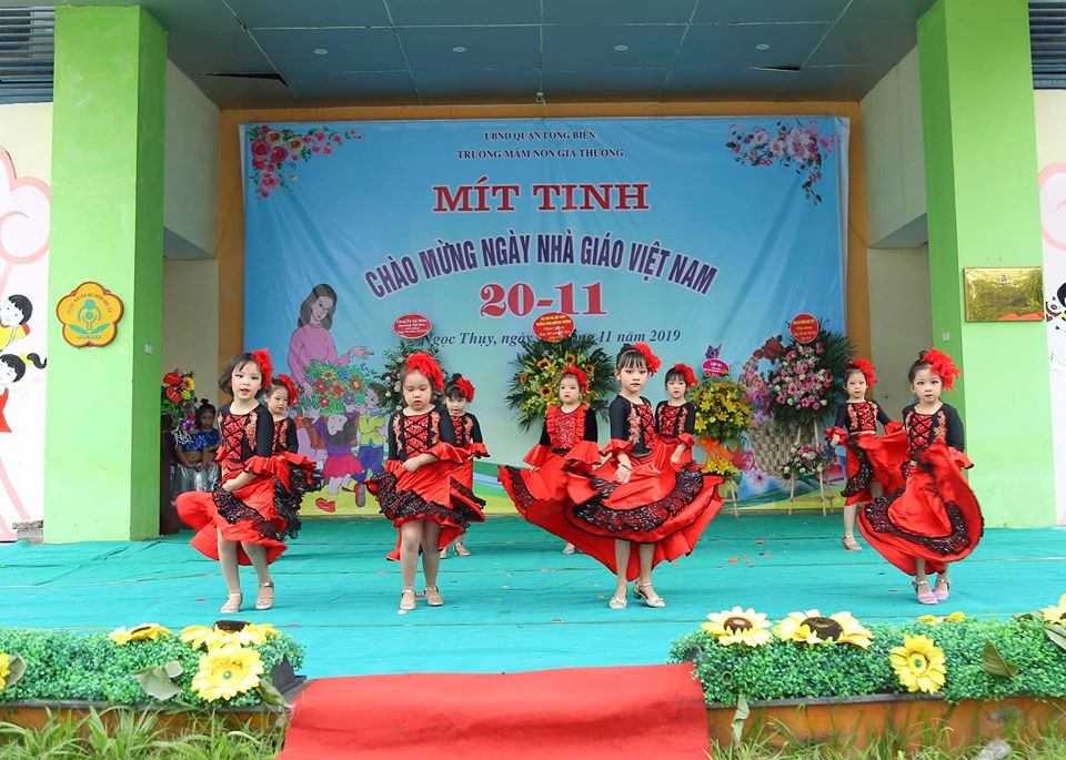 Các bé lớp MGL A5 cùng các bạn lớp khác trong đội văn nghệ của trường đang biểu diễn văn nghệ ở sân khấu ngoài trời tặng các cô giáo nhân ngày 20/11