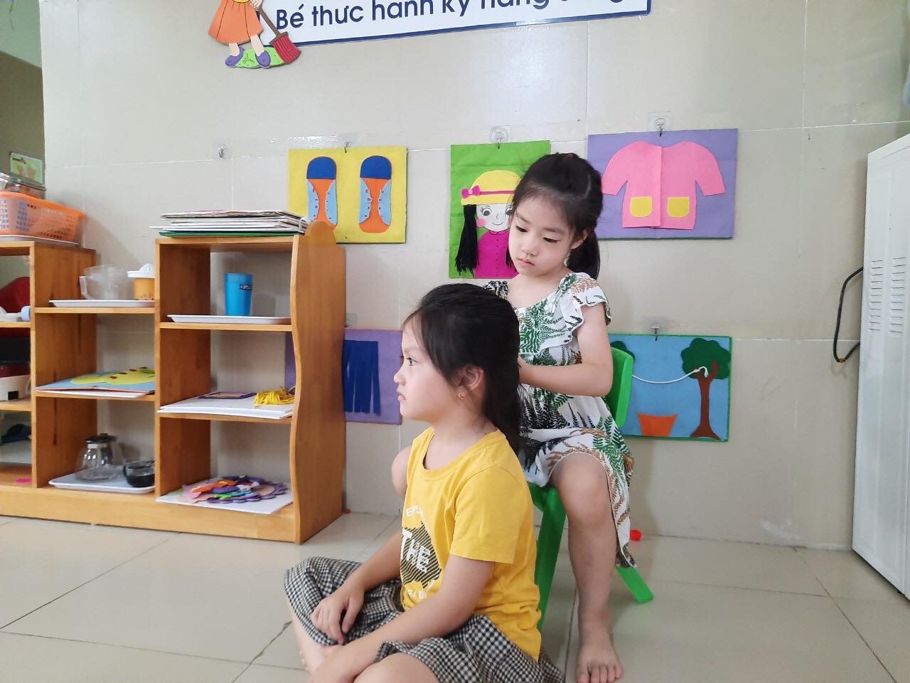 Bé thực hành kỹ năng buộc tóc
