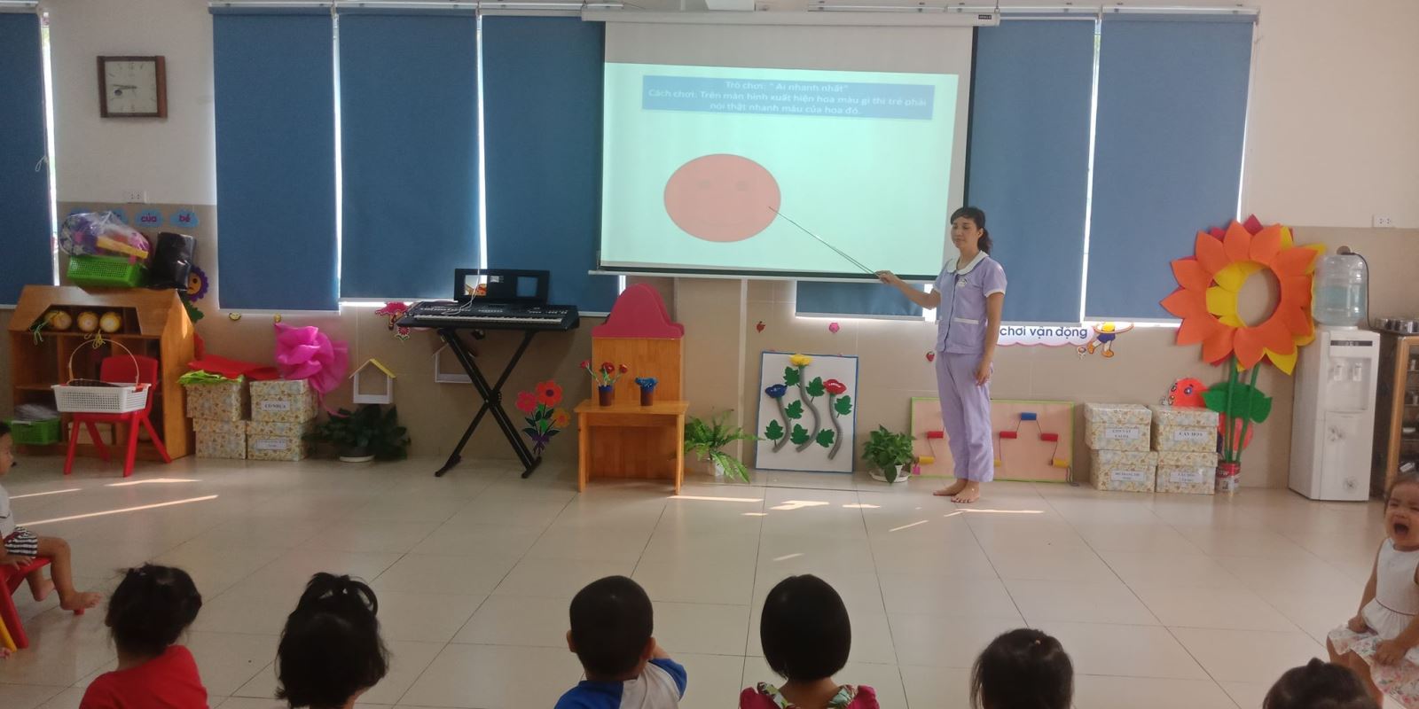 Cô cho trẻ chơi trò chơi: " Màu gì xuất hiện".