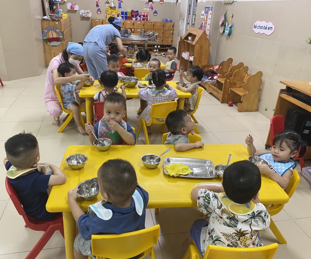 Các bé cùng tập xúc cơm ăn thật giỏi.