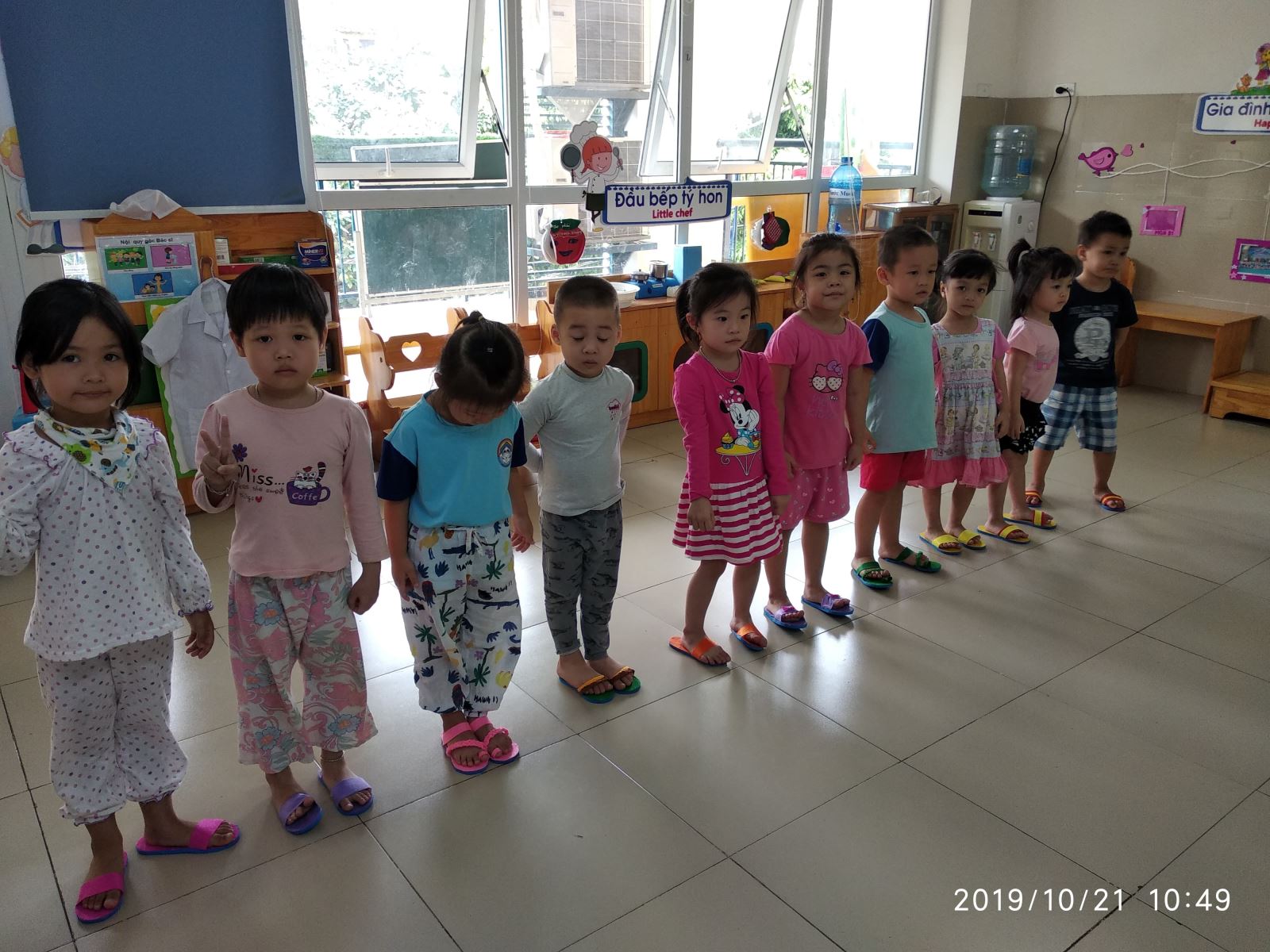 Các bé chia đội để chơi trò chơi "Tìm đồ dùng cho đủ đôi"