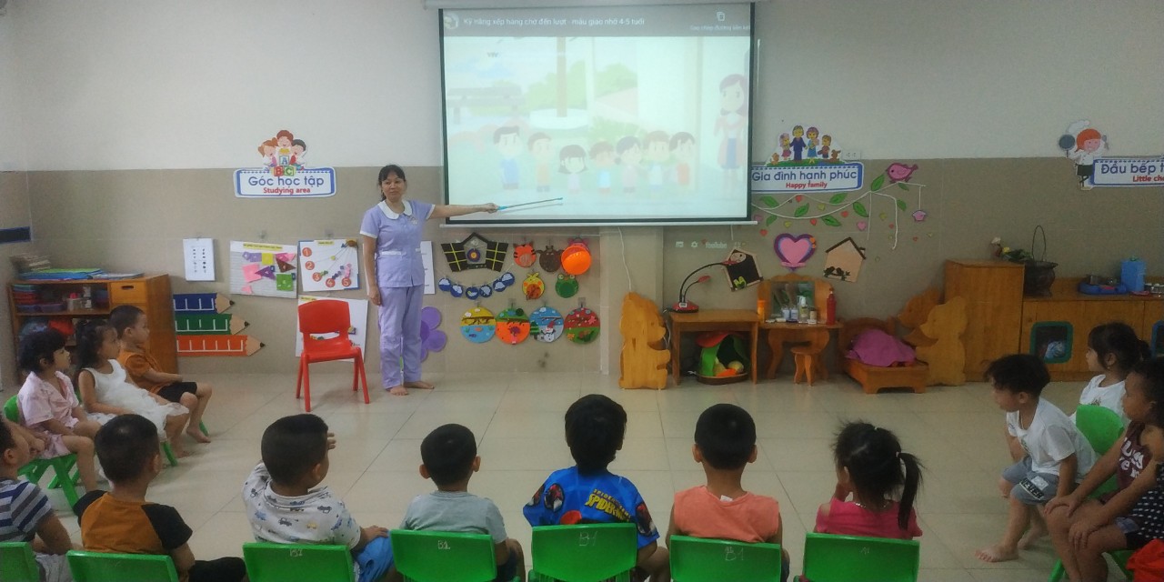 Cô giáo trò chuyện về lợi ích của việc xếp hàng cho các bé MGN B1 nghe
