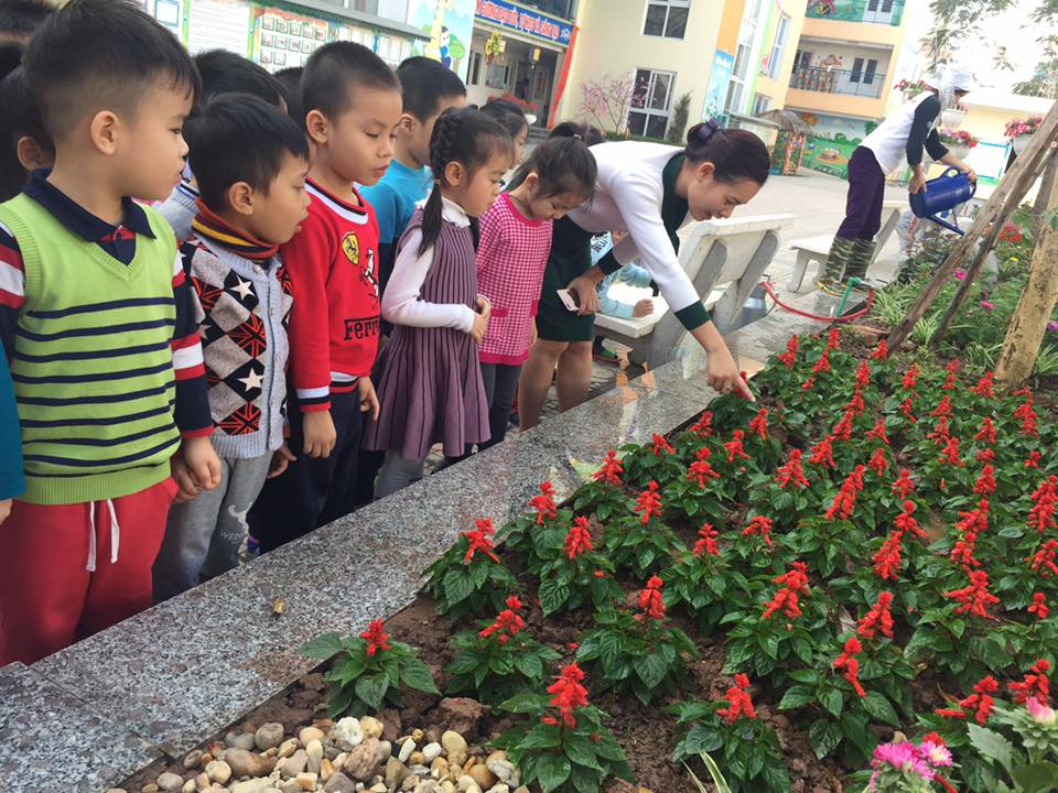 Sắc hoa nở thắm từng góc sân trường, khoảng trời cho bé vui chơi thêm rực rỡ, thêm tươi đẹp. Các bạn ấy có những câu trả lời ngây ngô rất đáng yêu khi được hỏi về từng loài hoa loài cây… Hoa có màu hồng tên là “hoa hồng”, hoa có màu trắng tên là “hoa trắng”… Khi cô giới thiệu về hoa, các bạn ấy đã tỏ ra rất thích thú ngắm nhìn và cảm nhận từng hương sắc riêng.